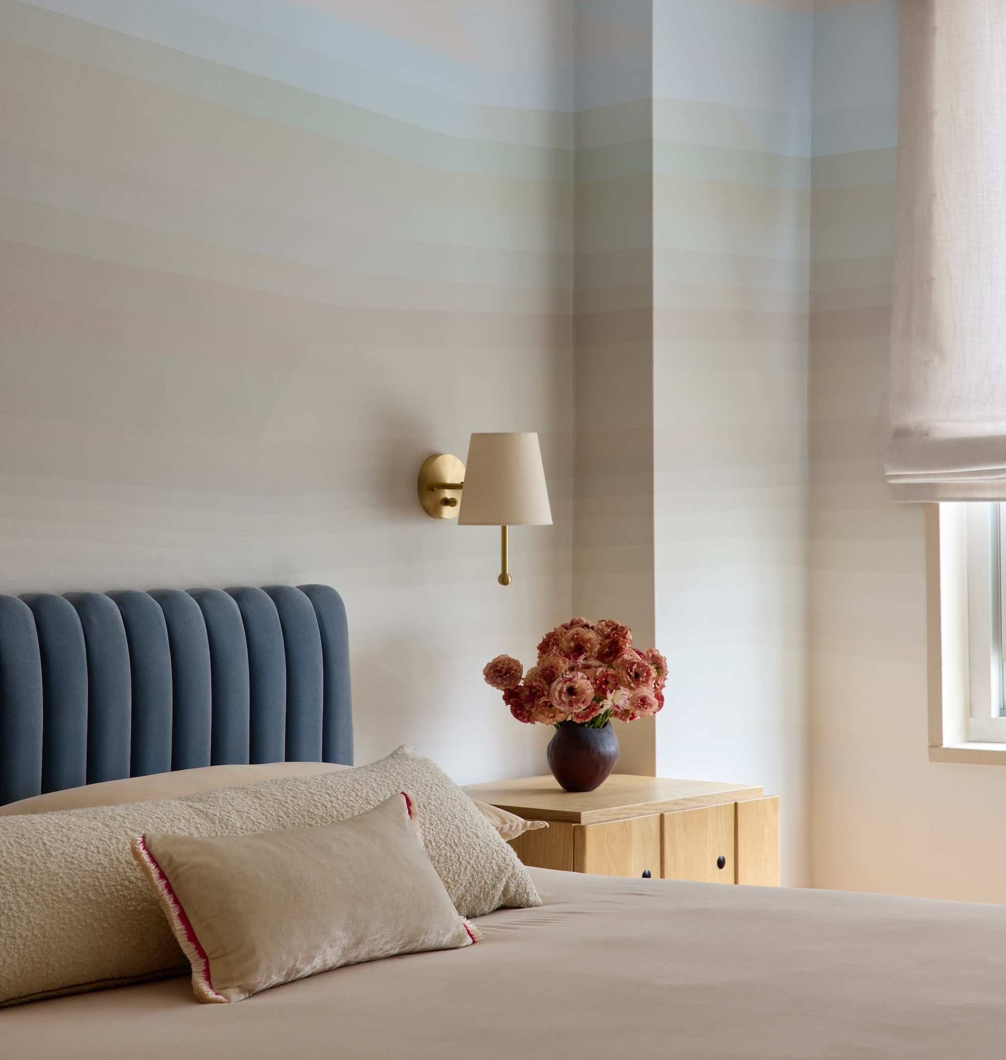 Laurie Blumenfeld Design brings calm sophistication to a Lenox Hill bedroom using our ALPENGLOW | MICA mural. Styled by Katja Greeff and photographed by Tim Williams, the twilight shades shift with natural light to enhance a tranquil, modern atmosphere.