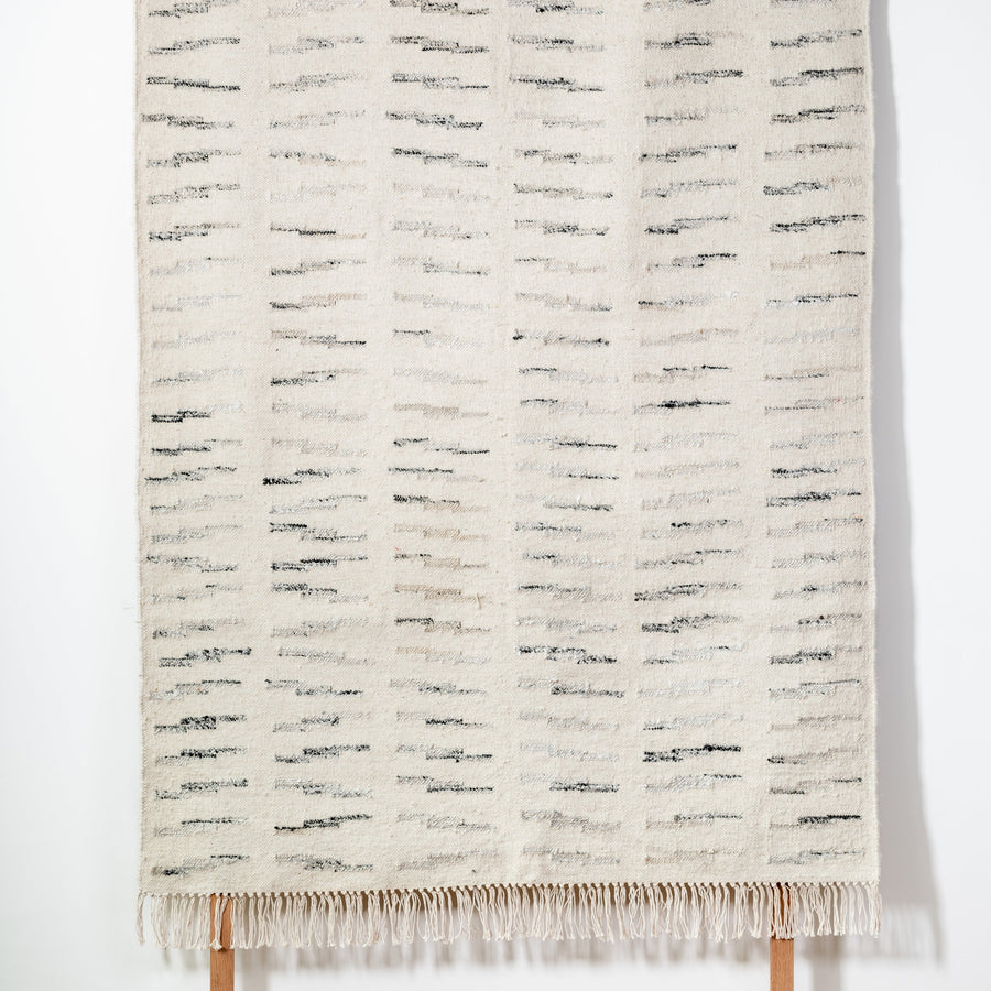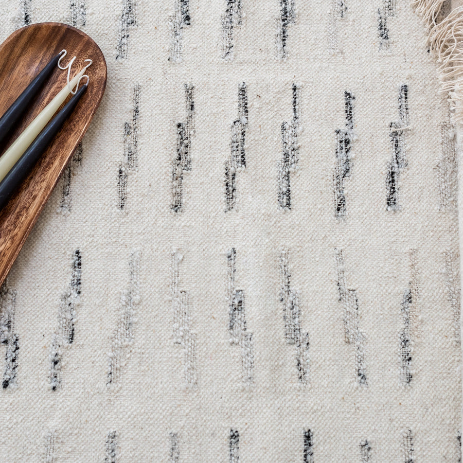 - hand-woven in india with a wool, cotton + sari silk blend